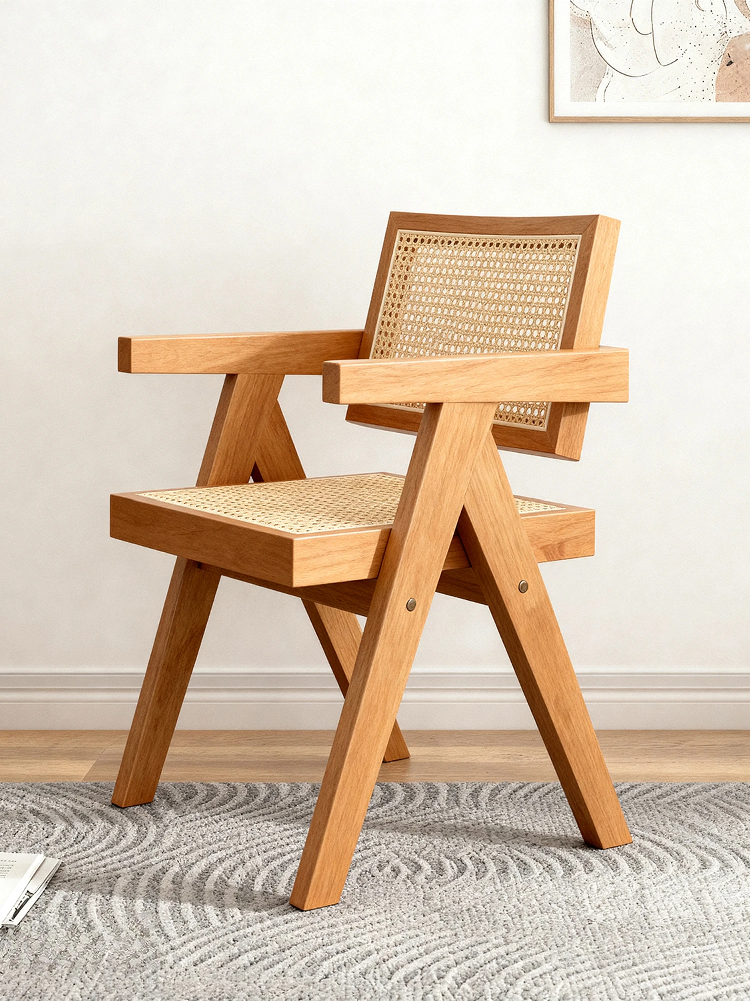 北欧風の無垢材とラタン編みのダイニングチェア - チャンディガールスタイルの侘び寂びデザイン、アンティーク調の宿泊施設やレストランに最適な背もたれ付きラタンチェア!心地よい座り心地と洗練された雰囲気をお楽しみください。