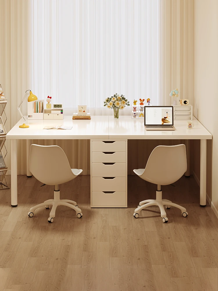 シンプルなホワイトデスク - お子様の学習や在宅勤務に最適!2人用の長いデザインで、勉強や仕事も快適に。おしゃれなドレッサーとしても使える多機能デスク。