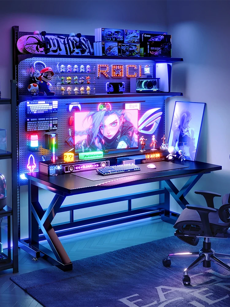 穴あきボード付きカーボンファイバーゲーミングデスク - 寝室や家庭に最適なスタンド収納ラック!快適なゲーム体験を提供するデスク&チェアセット!