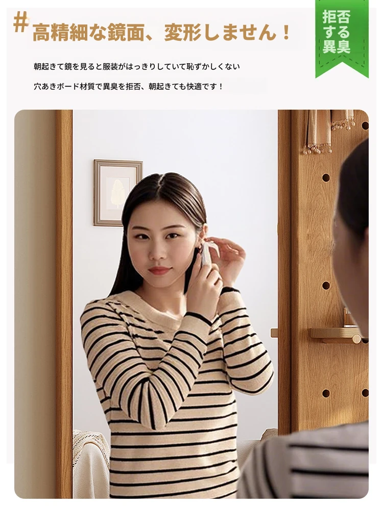 天然木製の穴あきボード付き全身鏡!おしゃれなベッドサイドや玄関にぴったりの収納ラック。省スペースで機能的、あなたの生活空間をスタイリッシュに演出します!