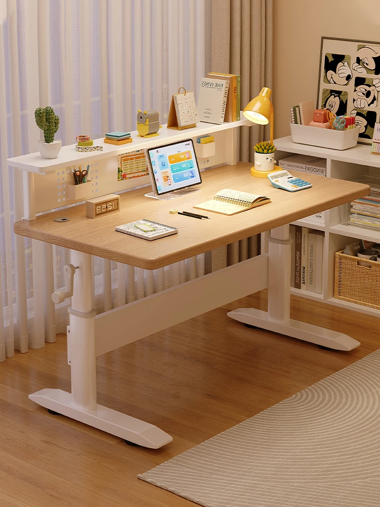 軽やかで洗練されたデザインの本格的な木製デスク!昇降機能付きのモダンな書棚付きデスクは、家での仕事や学習に最適。快適な作業環境を提供するスタイリッシュなデスクと椅子のセット!